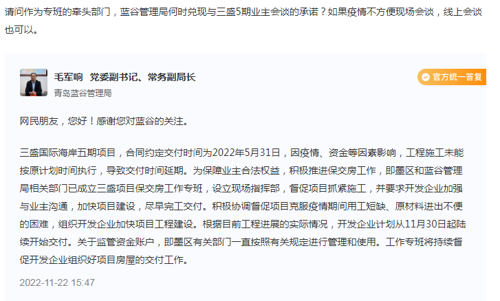 主持人好,各位网民朋友们,大家好!很高兴来到《民生在线》栏目,和大家进行交流。借此机会,向长期以来关心支持蓝谷发展的朋友们表示衷心的感谢!今年以来,在市委、市政府的坚强领导下,青岛蓝谷聚焦实体经济和招商引资、城市更新和城市建设、作风能力提升三条主线,按照“11365”发展思路,锚定海洋科学城的目标定位,谷区一体、协同发力,加快构建具有全球影响力的海洋科技创新策源地,建设国内领先的海洋经济发展示范区,打造宜居宜业宜游的高品质蓝谷新城,扎实把市第十三次党代会赋予蓝谷“双核”引领、蓝谷新城的使命落到实处。今天来到“民生在线”这个平台,倾听来自网民朋友的声音,借助大家的智慧,改进和提升我们的工作,欢迎大家多提宝贵的意见建议。