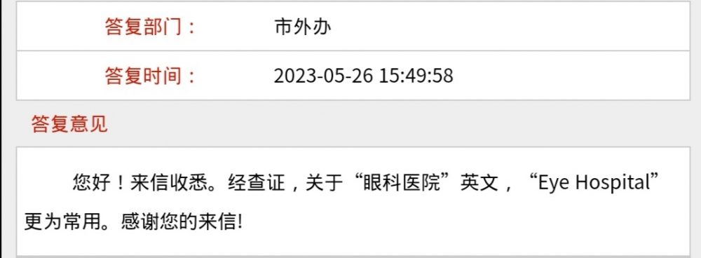 公交车眼科医院报站是“Ophthalmologic Hospital”,市外办给出的意见“Eye Hospital”更为常用,医院官网也是“Eye Hospital”