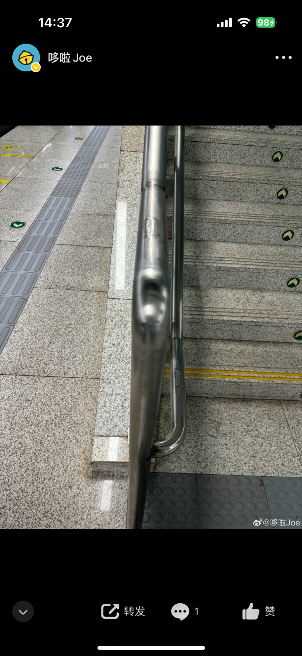 全线部分车站左侧高处扶手盲文被抹掉,仅保留右侧高处扶手盲文不合理,因为左侧也有盲人乘客过来的路径,盲人乘客并看不到仅有的右侧高处扶手盲文,也与线网左右两侧扶手都设有盲文不一致。