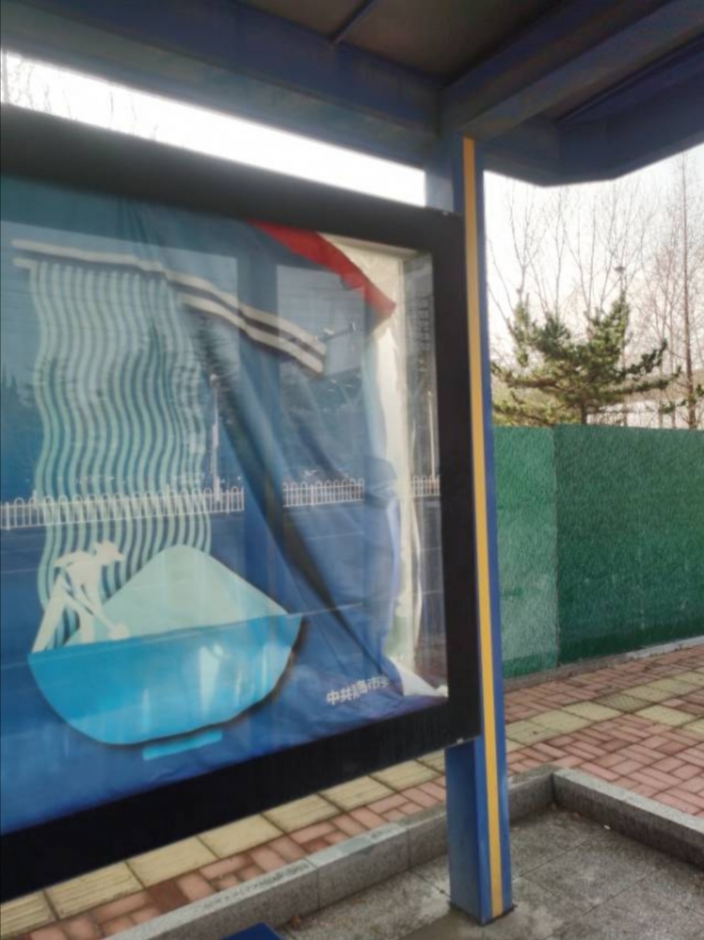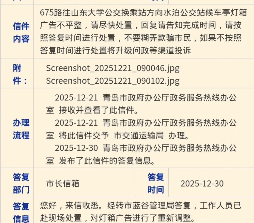 675路往山东大学公交换乘站方向水泊公交站候车亭灯箱广告不平整,蓝谷管理局在政府信箱回复对广告灯箱进行了重新调整,请在民生在线回复上传处置之后照片向市民证明问题处置,不要视而不见
