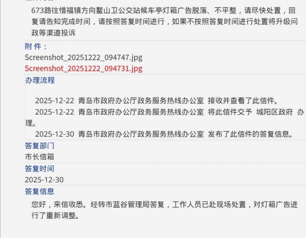 673路往惜福镇方向鳌山卫公交站候车亭灯箱广告脱落、不平整,蓝谷管理局在政府信箱答复已经对广告进行重新调整,请在民生在线回复上传处置之后照片,民生在线可以在回复上传照片,请不要视而不见。