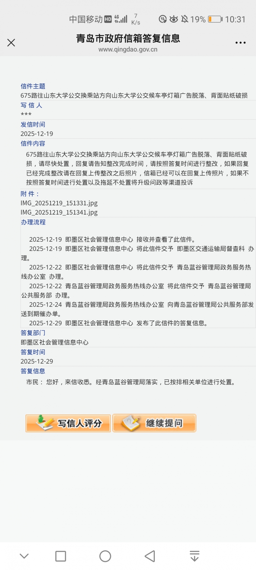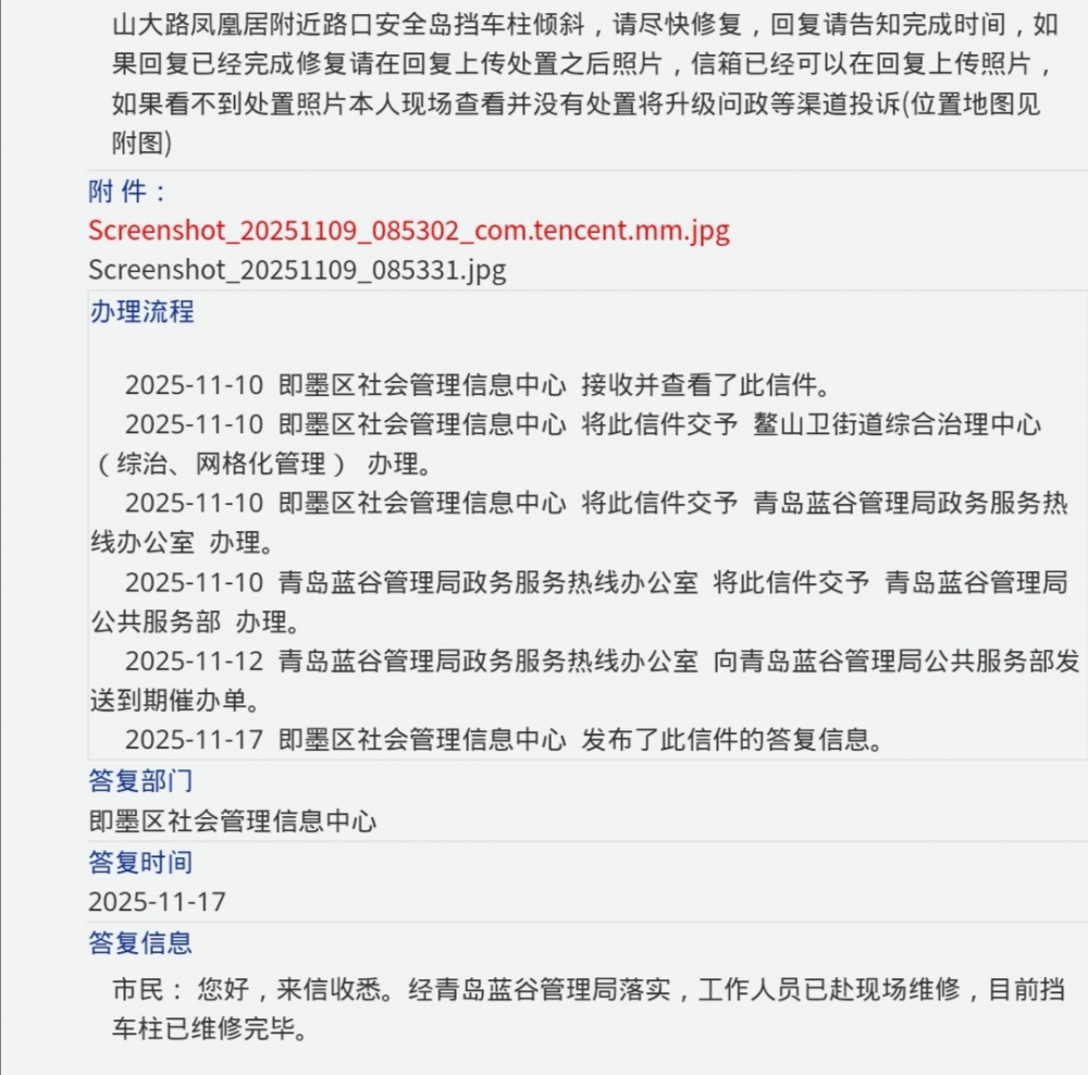 青岛政务网即墨区信箱、蓝谷管理局信箱、民生在线、都已经可以在回复上传照片,市民也要求上传处置照片,可是很多部门却对市民要求上传处置照片视而不见,仍然没有在信箱、民生在线等渠道回复上传处置之后照片,请蓝谷管理局领导督导蓝谷管理局各部门以及辖区街道、社区能够在青岛政务网信箱以及民生在线回复里面主动上传处置之后的照片,也可以督促部门如实处置办理市民提出的问题,向市民证明问题处置,市民也好根据照片对部门答复进行评价,而不是非得市民亲自去现场落实问题整改情况。