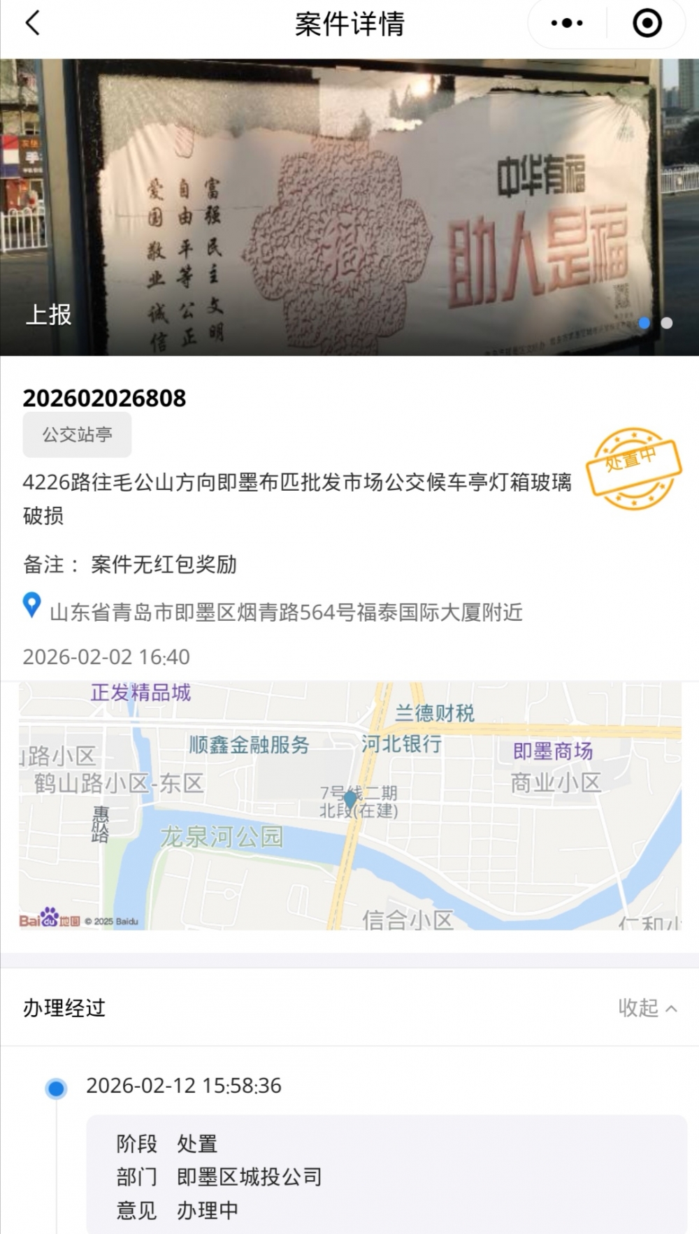 2月2日在爱山东全民城管点靓青岛(数字化城管)反馈的4226路往毛公山方向即墨布匹批发市场公交候车亭灯箱玻璃破损,已经一个月了还没看到完成处置,请即墨区领导督促相关部门抓紧时间安装玻璃,回复请告知何时完成处置,不要让相关部门继续拖延下去,处置之后请在全民城管点靓青岛平台以及民生在线回复分别上传整改之后照片并在全民城管点靓青岛平台申请结案