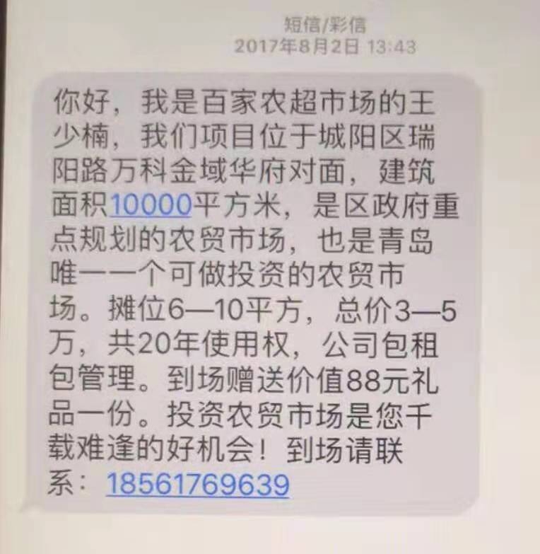 谢书记您好,城阳瑞阳路百家农超打着政府扶持的民生工程,欺骗我们老百姓的血汗钱,他们已经构成违法融资,市场迟迟不招商,诺大的市场一直空着,导致我们购买摊位的业主血本无归,望解书记根据老百姓实际反映的情况考察下,期待谢书记诚恳的答复!