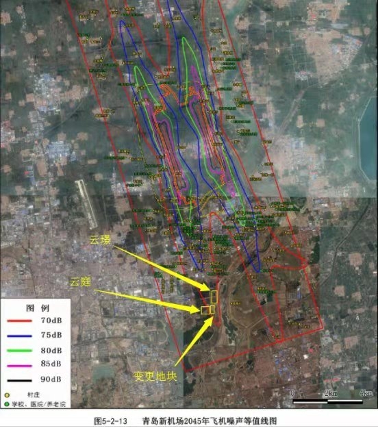 该小区审批时依据《青岛新机场总体规划》中的近期远期噪声线,该噪声线来自于《青岛新机场总体规划》中的机场近期(2025年)飞机噪声等值线图和机场远期(2045年)飞机噪声等值线图,该总体规划是由青岛国际机场集团有限公司组织、中国民航机场建设集团公司编制,于2015年11月30日中国民用航空局和青岛市人民政府联合批复。