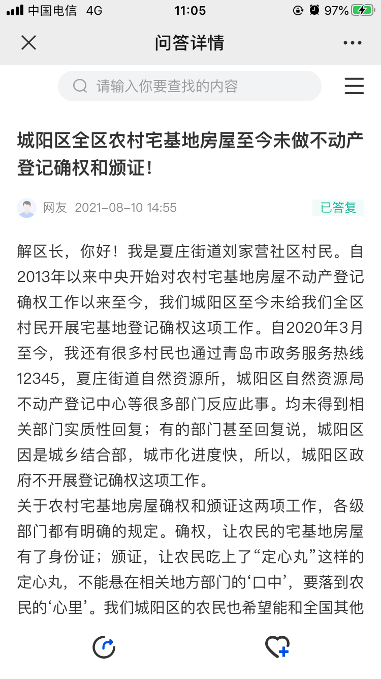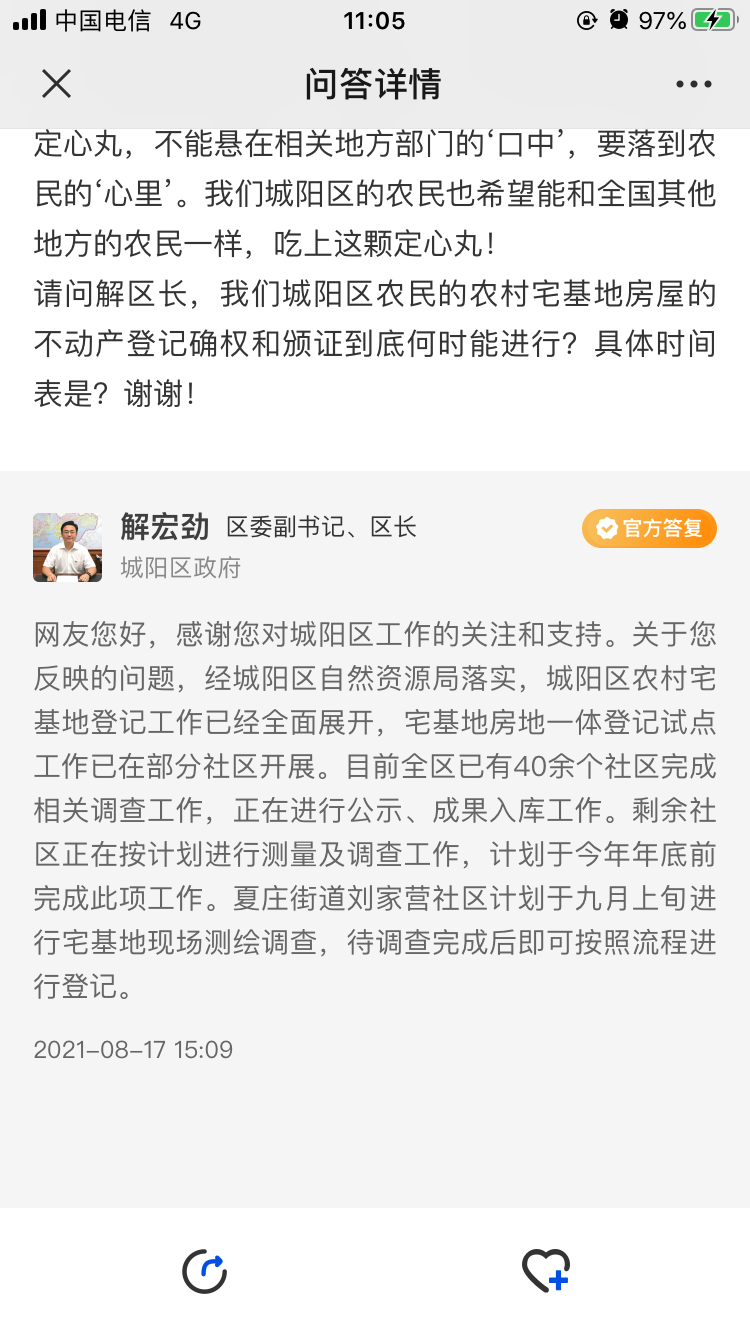 我是城阳区夏庄街道刘家营村村民。2021年8月10日14:55本人在城阳区解宏劲区长做客《民生在线》栏目时,曾向解区长咨询:夏庄街道刘家营村何时进行农村宅基地房屋的不动产登记确权这项工作?解区长在2021年8月17日15:09答复我们:“夏庄街道刘家营社区计划于九月上旬进行宅基地现场测绘调查,待调查完成后即可按流程进行登记”。但是,截止到今天11月3日,我们村的宅基地确权依然没有开始。中间本人也多次电话咨询相关部门的工作人员,得到答复:夏庄街道相关负责人未能做通刘家营社区书记的工作,社区书记不同意给我们村民进行宅基地确权!请问姜局长,这是什么情况?!