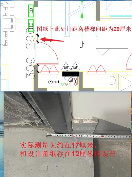 此误差的存在导致:门口和下行楼梯的间距不足17厘米,严重小于相关规范中的要求:门洞距离楼梯踏步边不易小于一个踏步宽度(260mm)。注:此处经政府信箱得到规划等部门确认设计图纸不存在问题,设计图纸上门洞距离楼梯踏步边为29厘米,设计符合相关规范,属于施工存在的重大误差。